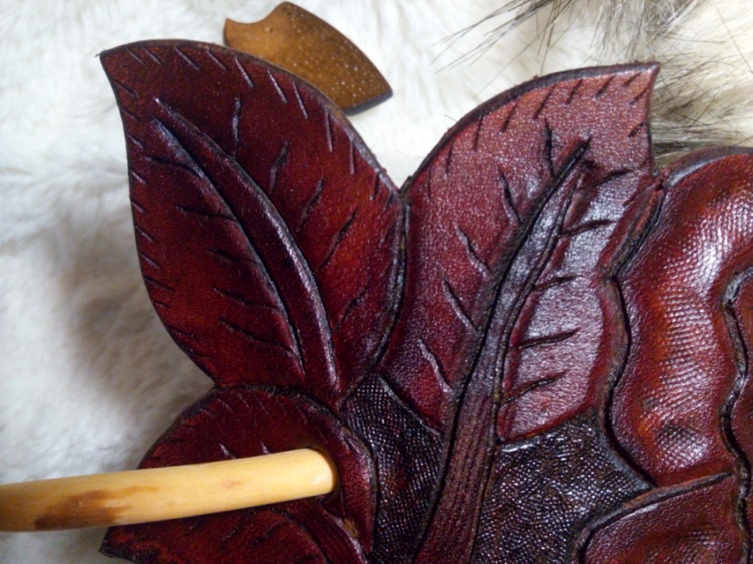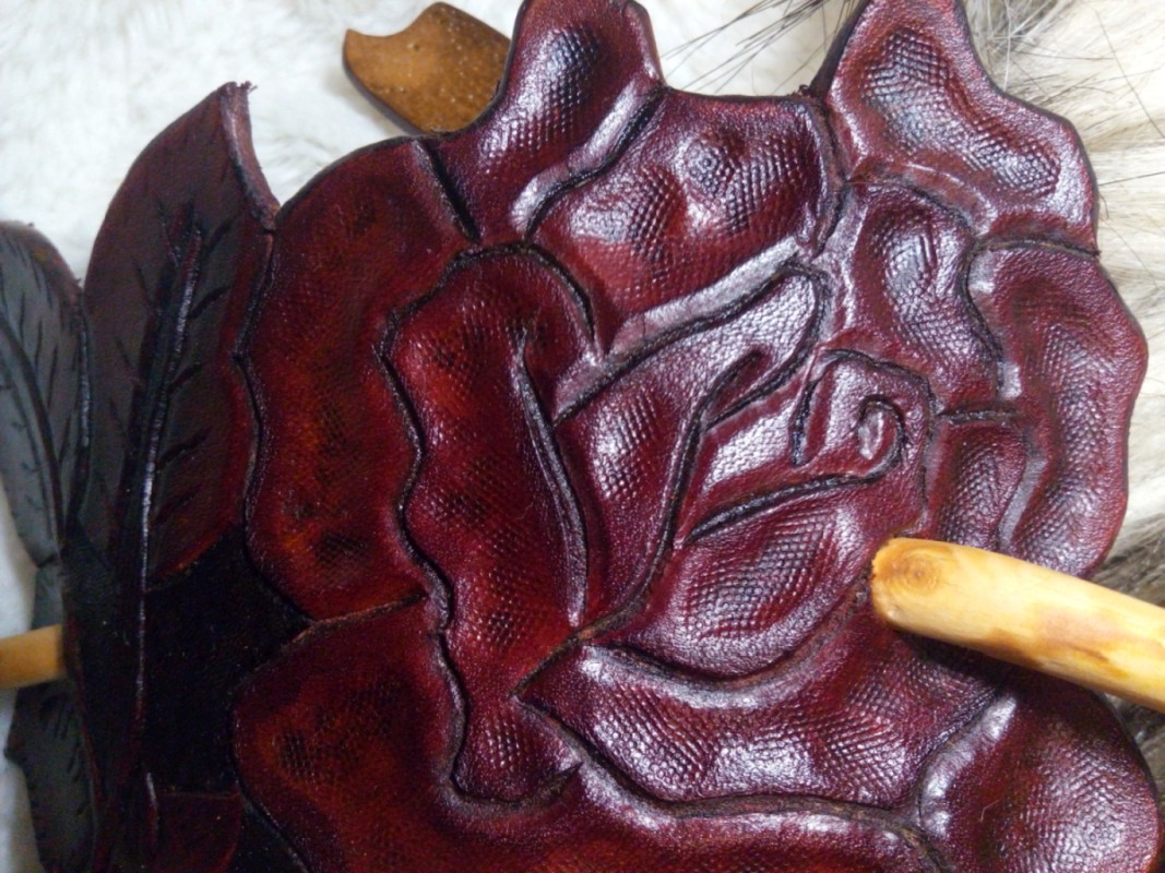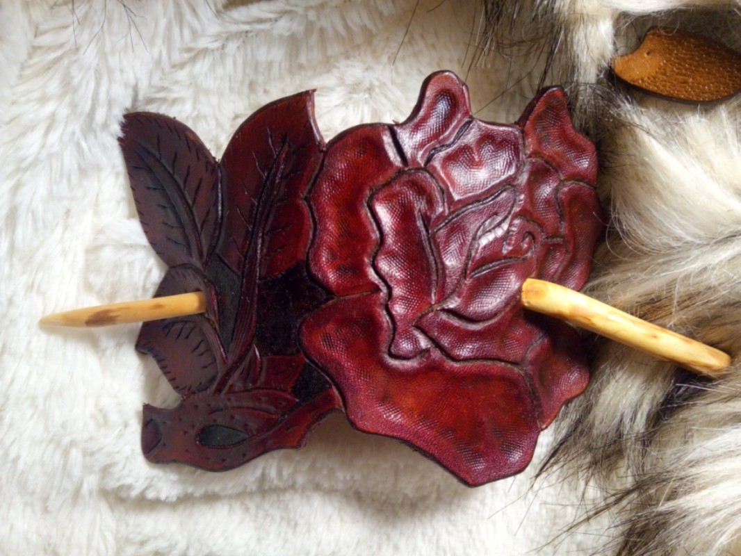 Duża ręcznie tłoczona spinka do włosów w kształcie róży z liśćmi. Krawędzie polerowane ręcznie. Zabezpieczono balsamem do skór. Patyk impregnowany olejem lnianym, dzięki czemu jest idealnie gładki i nie czuć “sztuczności” jak to jest czasami, gdy zabezpiecza się drewno lakierem.