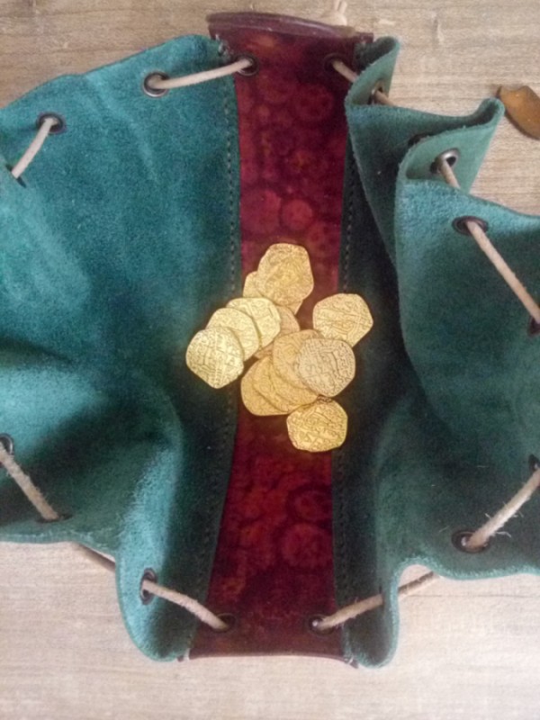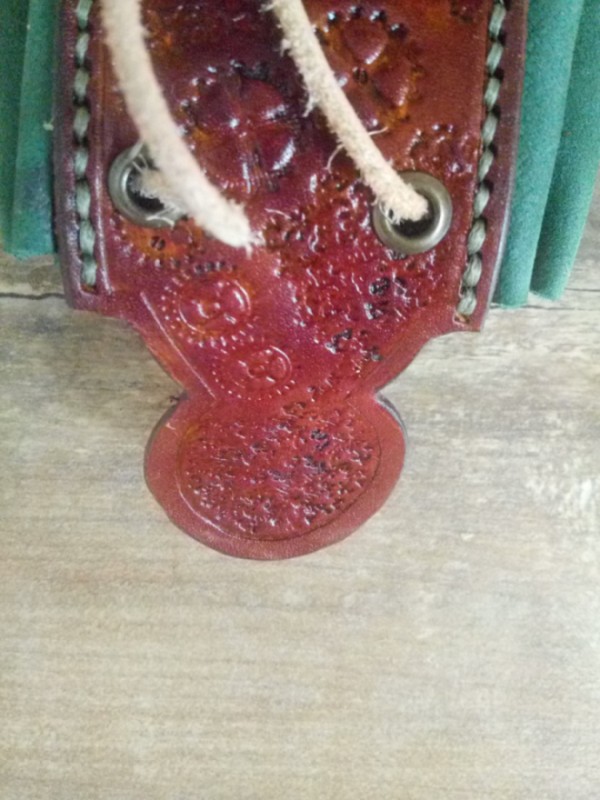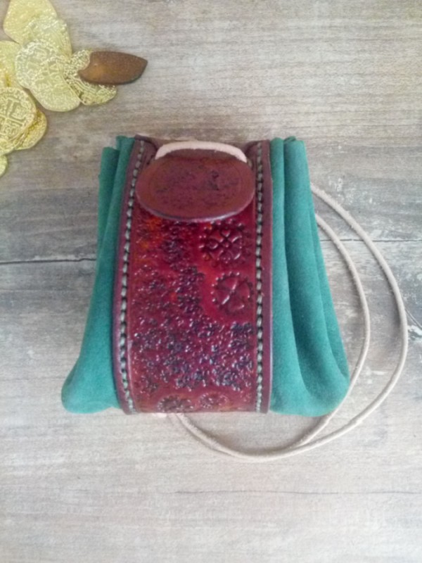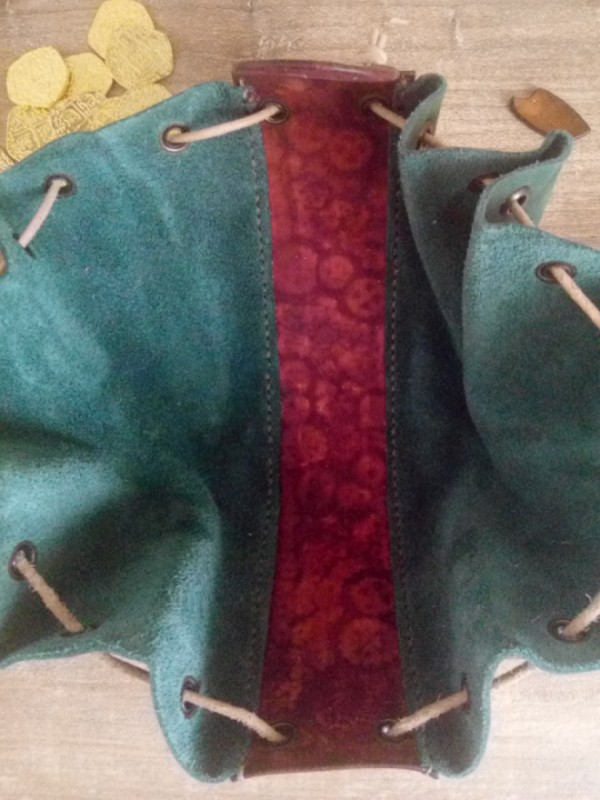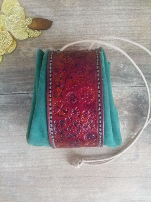 Ręcznie robiona skórzana sakiewka z dwóch rodzajów z skóry: bydlęcej garbowanej roślinnie i nebuku. Motyw steampunkowy. Ręcznie tłoczona (rzeźbiona). Oczka metalowe. Wiązane na rzemień. Zabezpieczone balsamem do skór, aby dłużej zachowały wygląd.