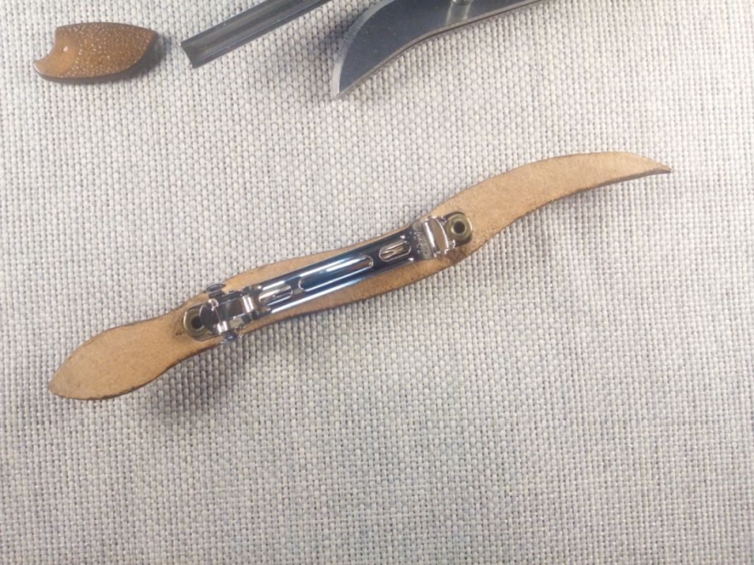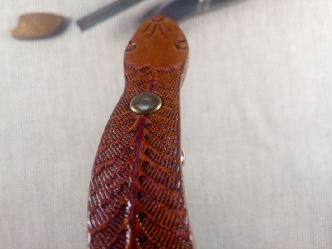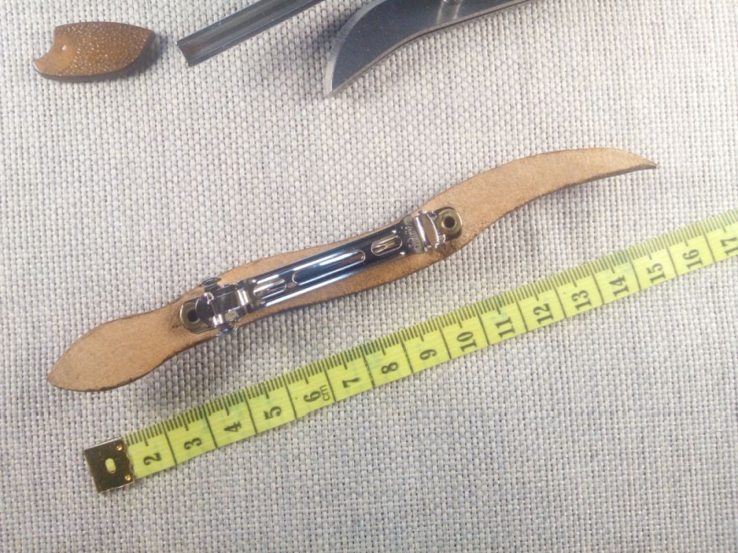 Ręcznie tłoczona skórzana spinka do włosów w kształcie węża. Przypinana do włosów klamrą. Spinka wykonana ręcznie (cięcie, tłoczenie, barwienie, polerowanie krawędzi). Zabezpieczono balsamem do skór.