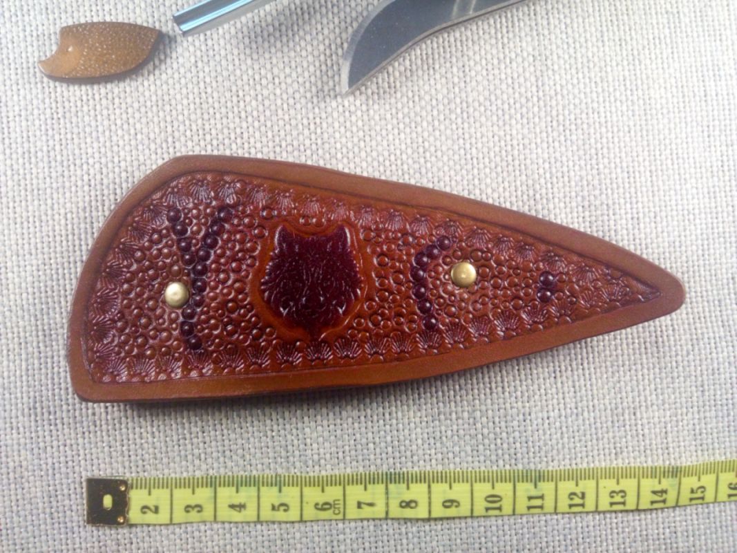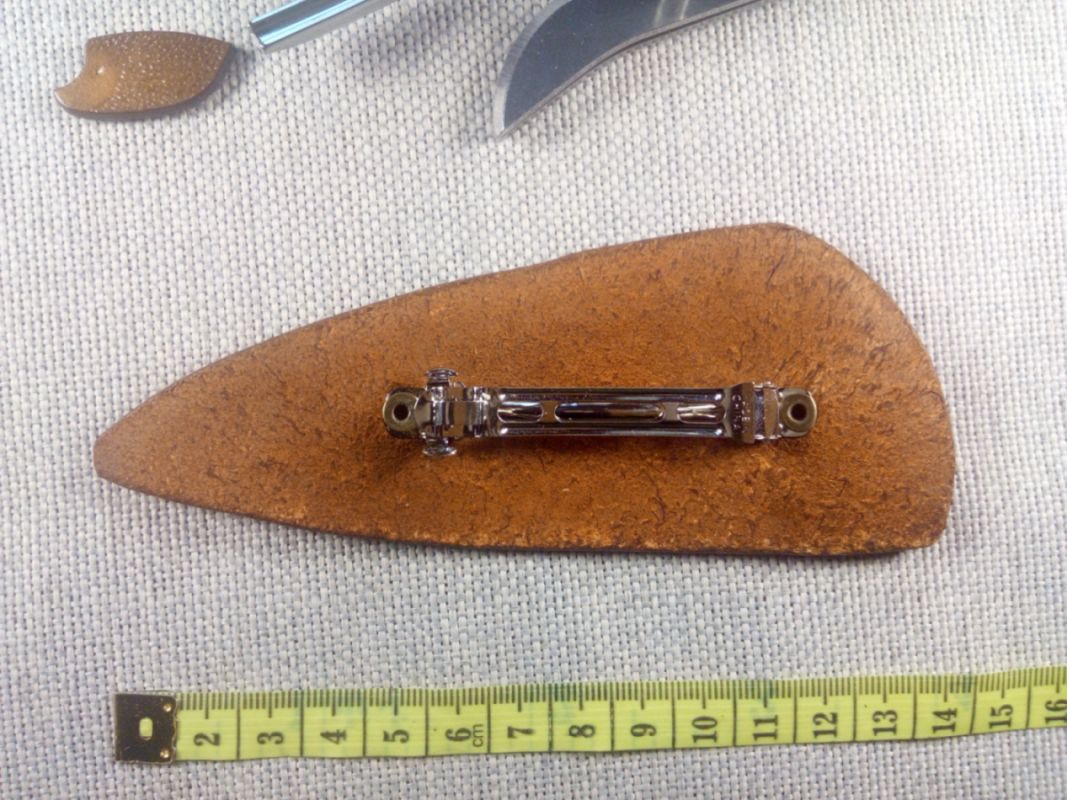 Ręcznie tłoczona spinka do włosów w wytłoczoną głową wilka. Przypinana do włosów na klamrę. Spinka wykonana ręcznie. Krawędzie polerowane ręcznie. Zabezpieczono balsamem do skór.