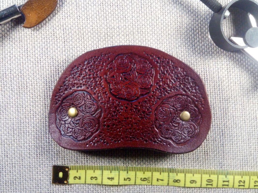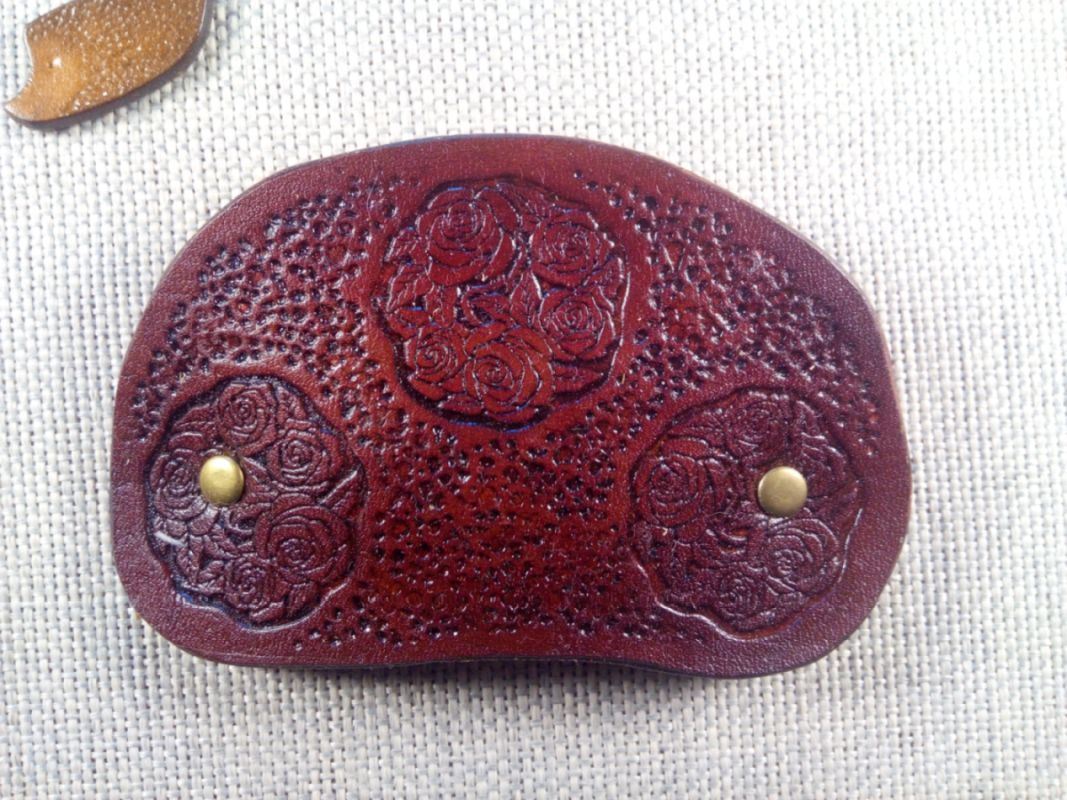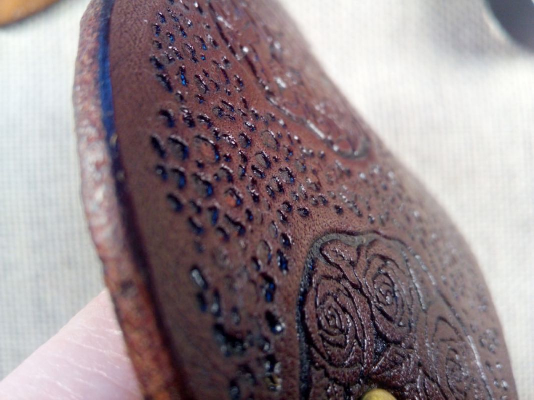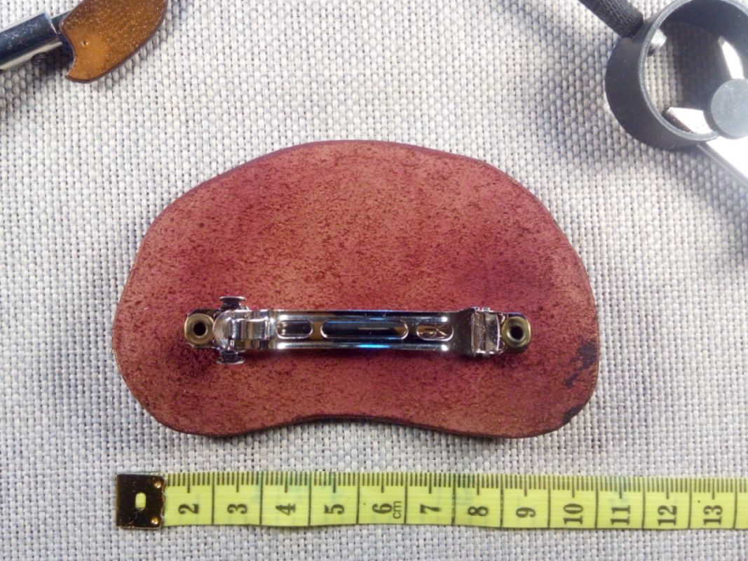 Spinka wykonana ręcznie (wycinana, tłoczona, barwiona). Przypinana jest na klamrę. Krawędzie polerowane ręcznie. Zabezpieczono balsamem do skór.