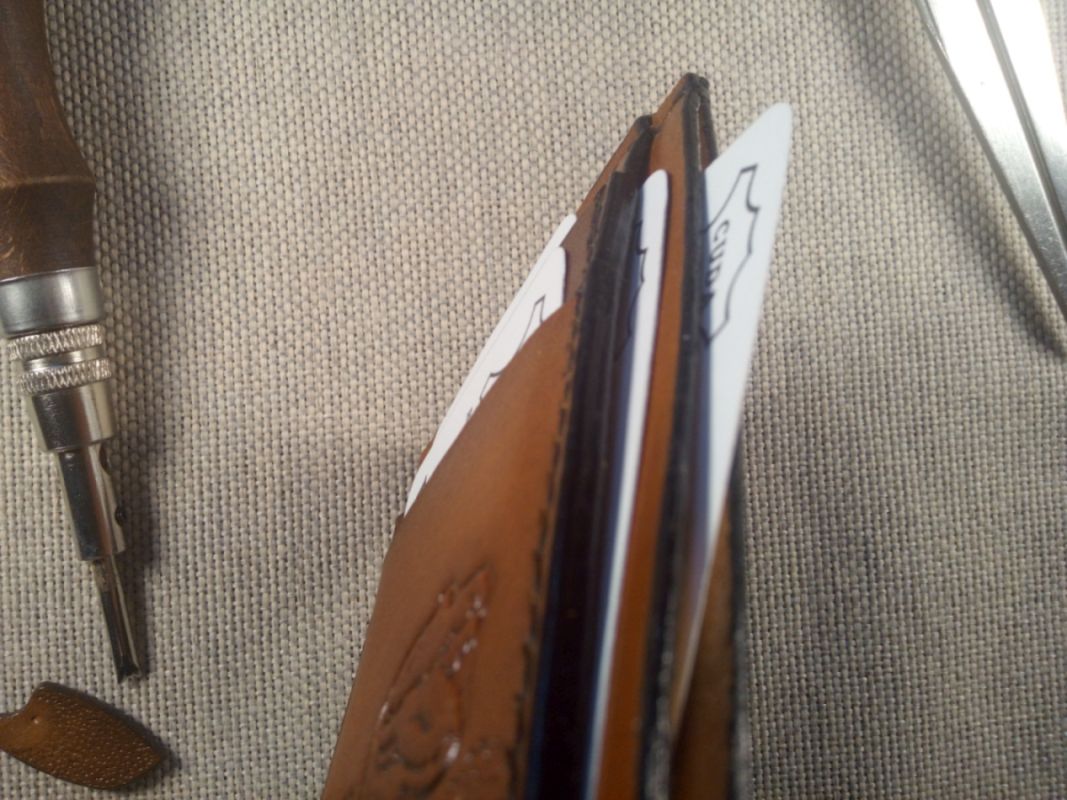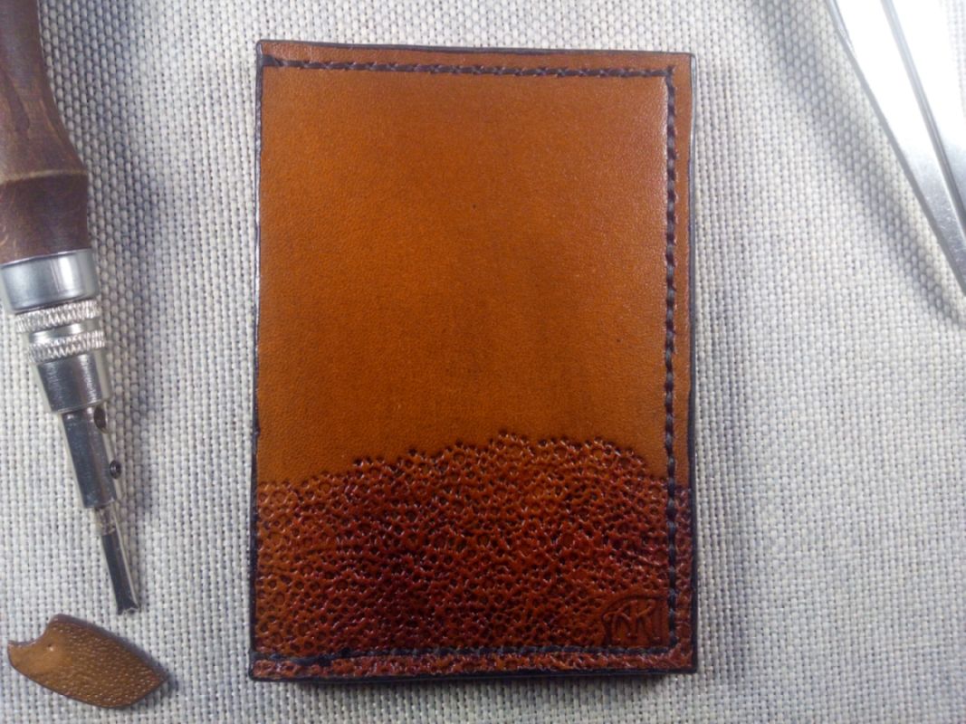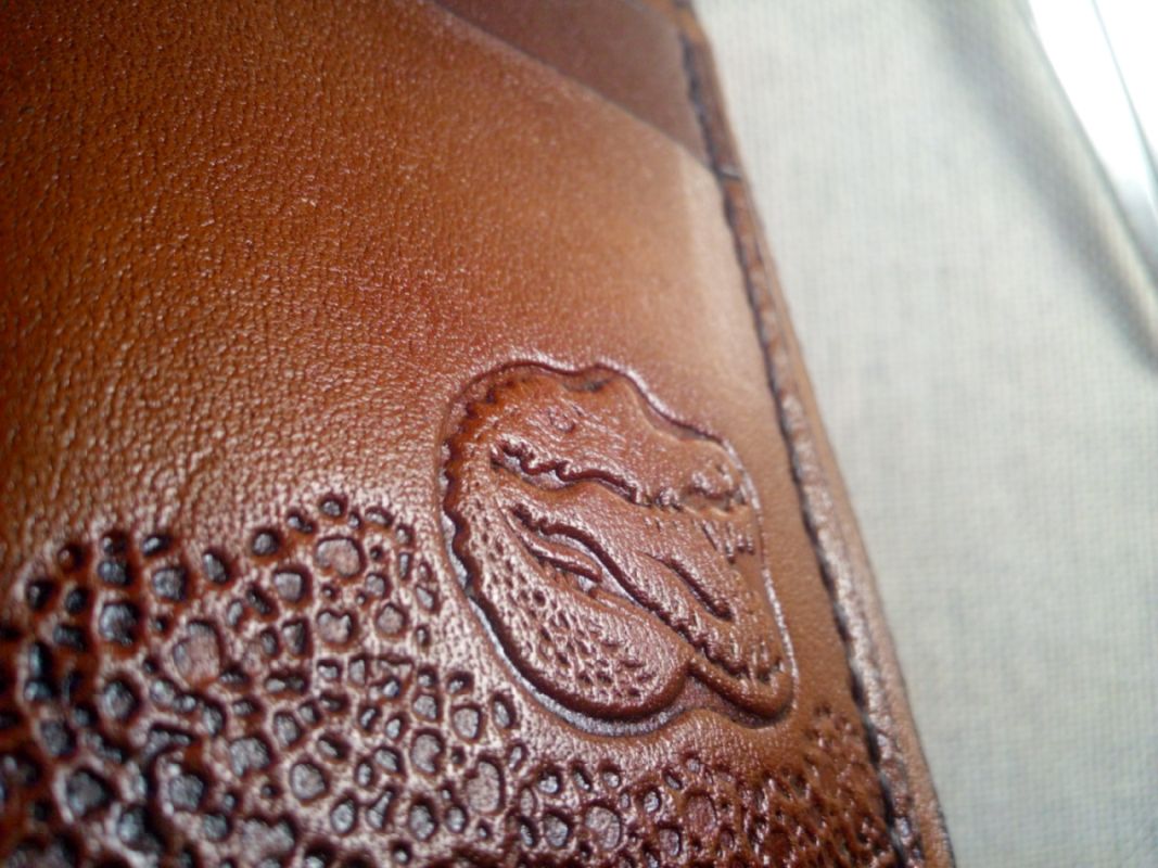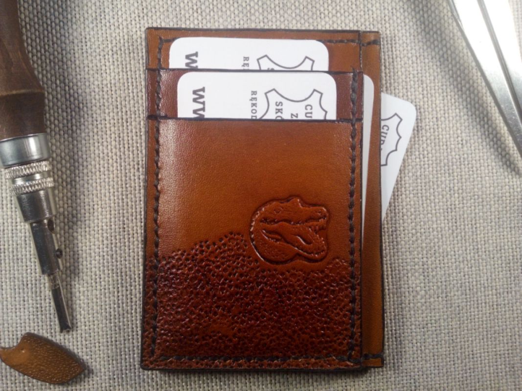 Ręcznie zdobione skórzane etui na karty płatnicze z motywem krokodyla. Jest to rękodzieło, wszystko robione ręcznie (cięcie, farbowanie, szycie, polerowanie). Zabezpieczono balsamem do skór.