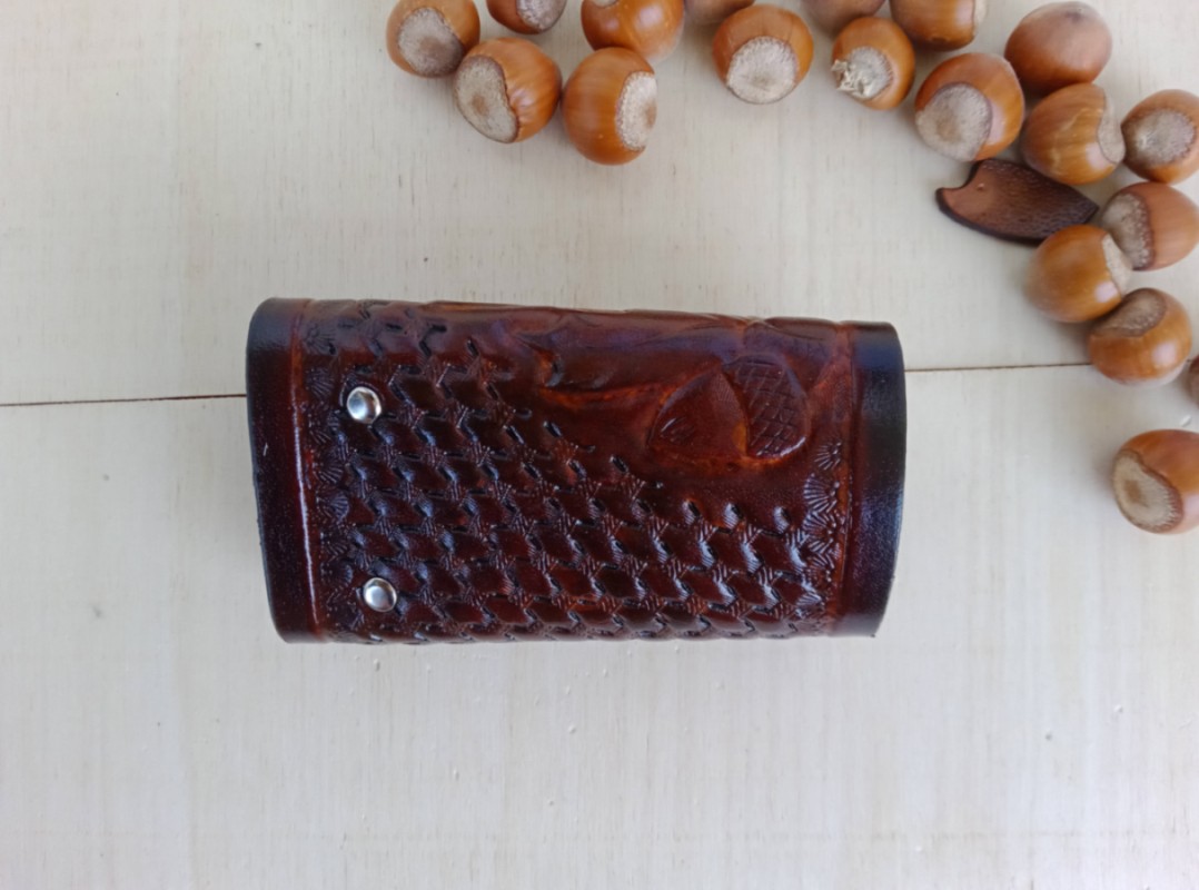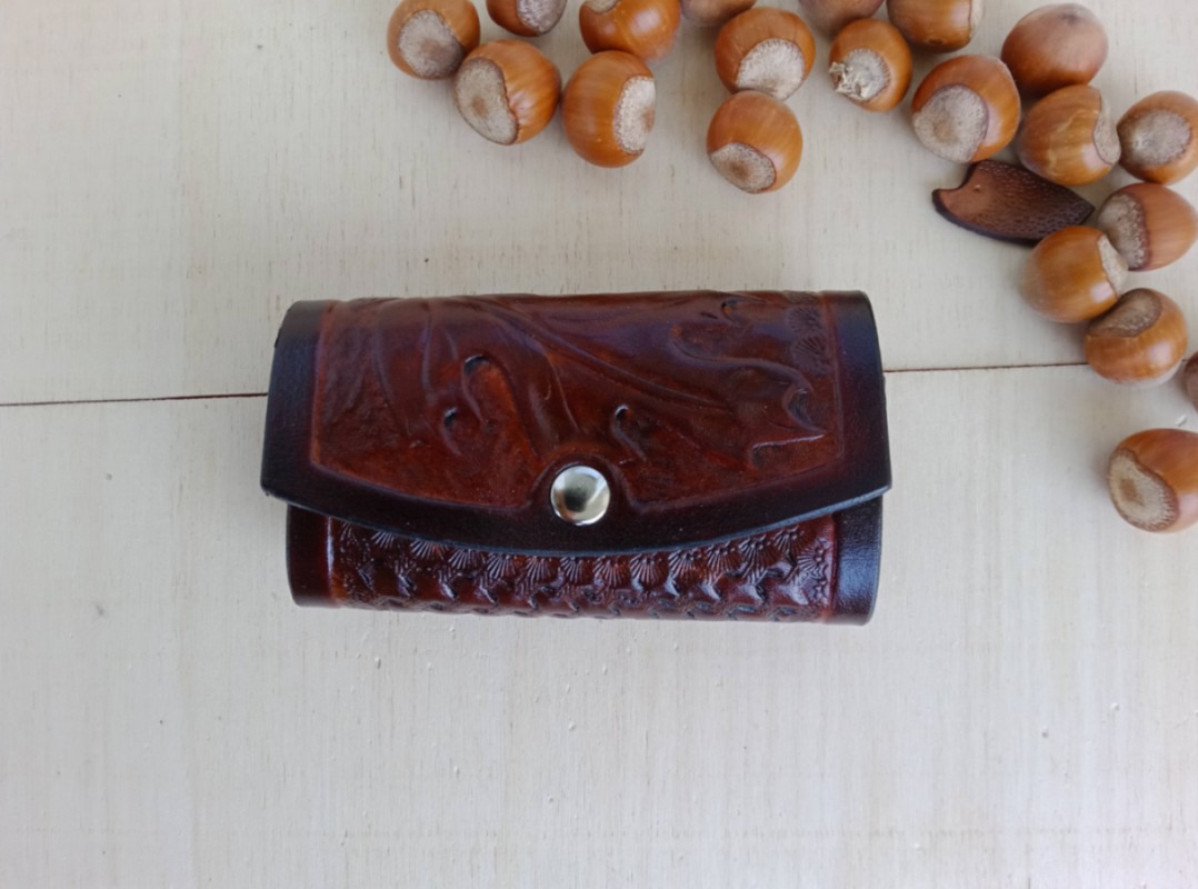 Skórzane etui na klucze. Motyw przewodni to liść dębu z żołędziami. Wewnątrz 6 karabińczyków na klucze. Zapięcie na zatrzask. Krawędzie polerowane ręcznie. Zabezpieczono balsamem do skór.