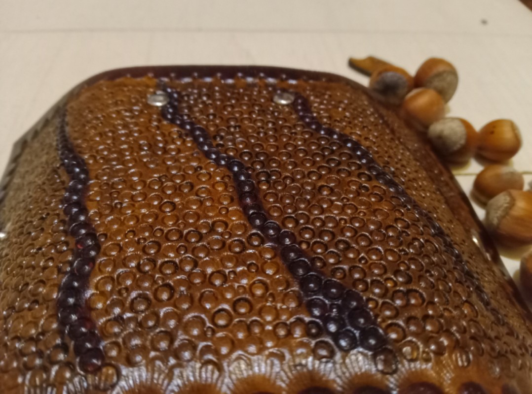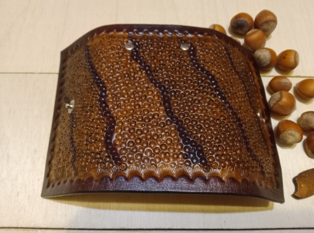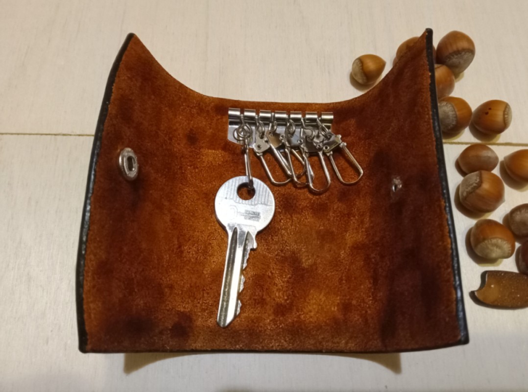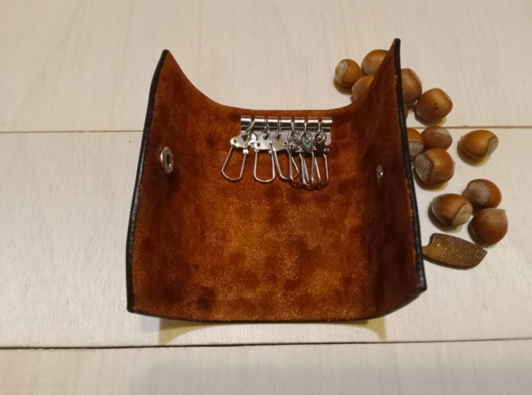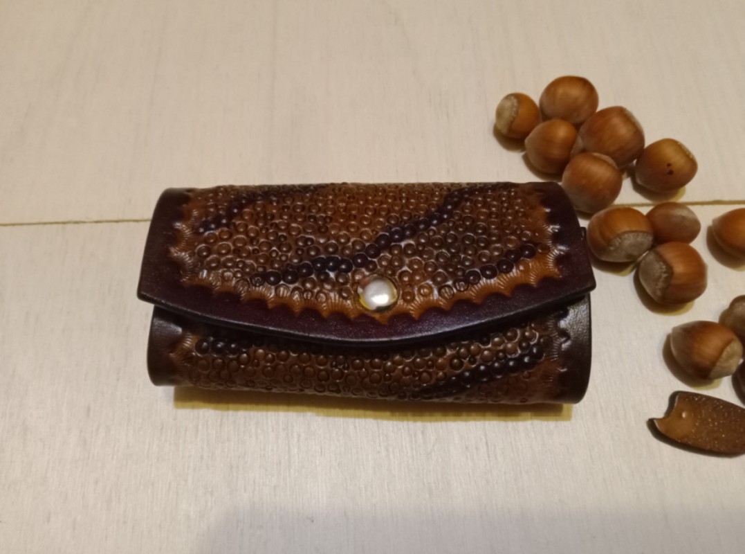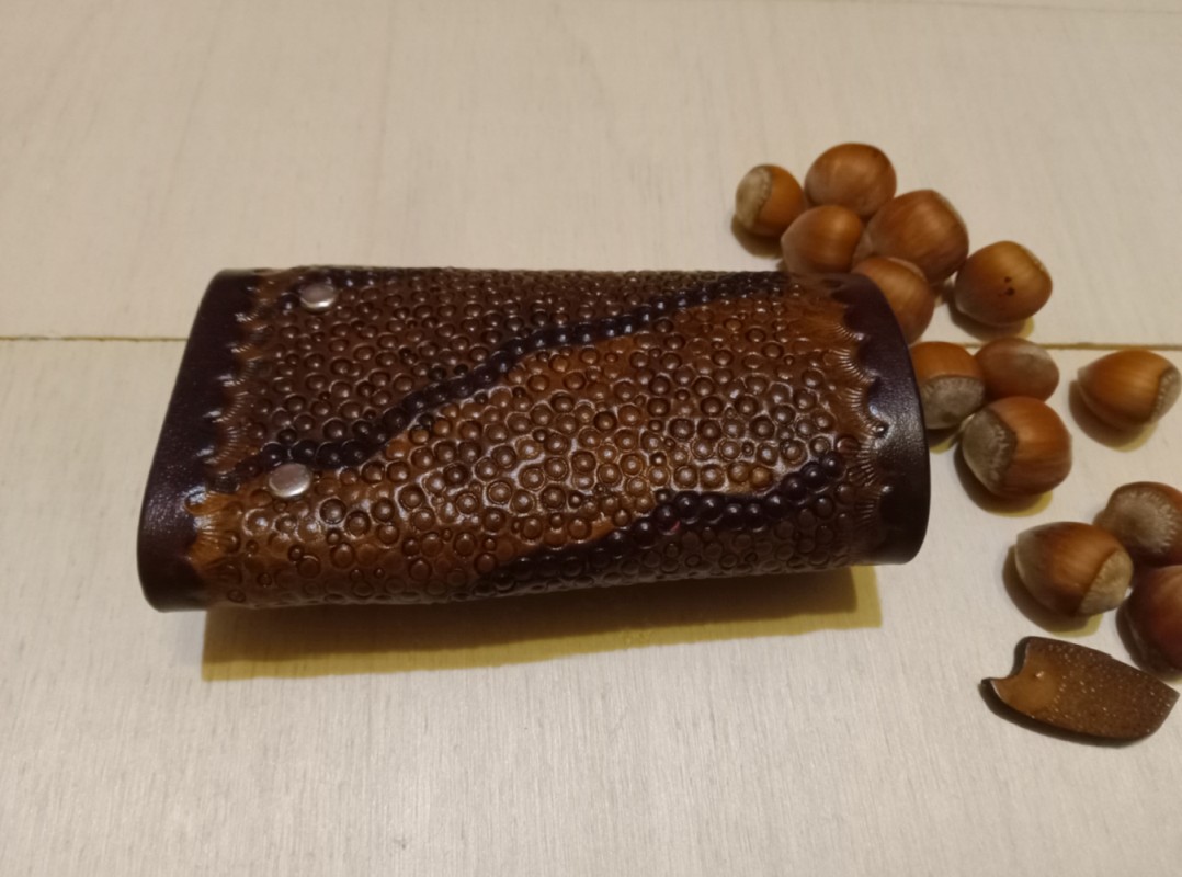Te etui na klucze zostało wykonane z naturalnej skóry bydlęcej garbowanej roślinnie o grubości 2,2 milimetra. Wyjątkowa faktura inspirowana smoczą skórą nadaje etui ekskluzywnego charakteru, podkreślając indywidualny styl użytkownika. Wewnątrz jest 6 karabińczyków na klucze. Całość wykonana ręcznie: cięcie, tłoczenie skóry, barwienie. Zapięcie na zatrzask. Krawędzie polerowane ręcznie. Zabezpieczono balsamem do skór.