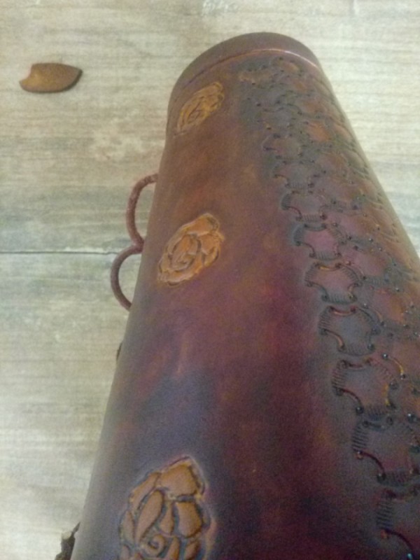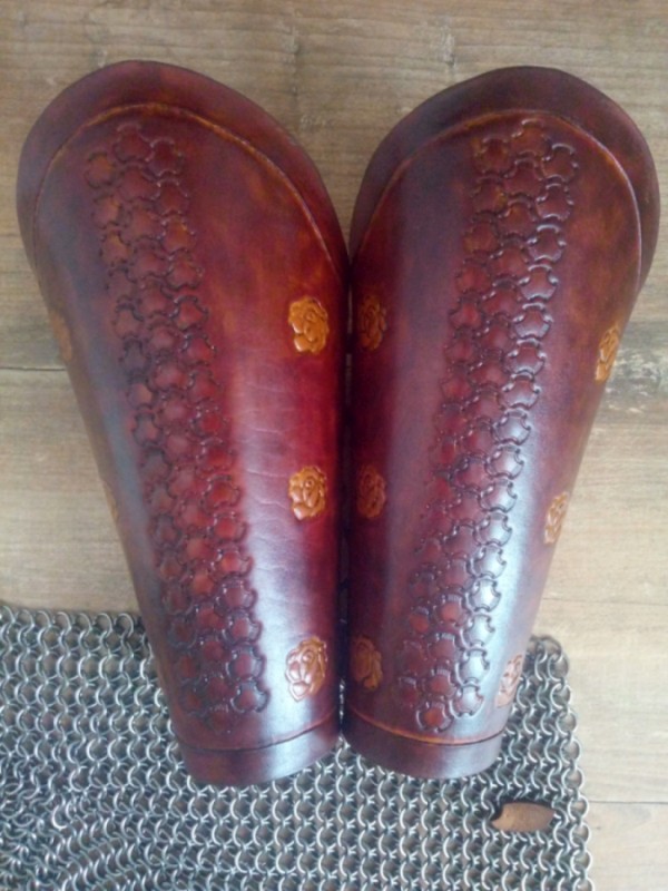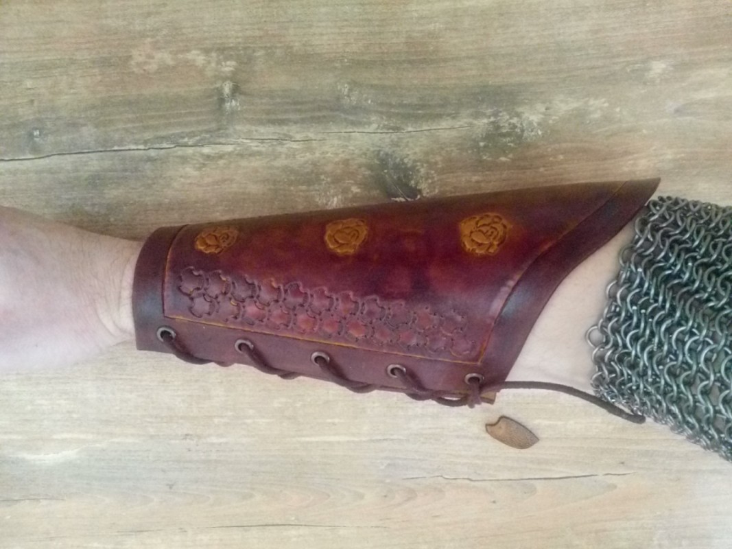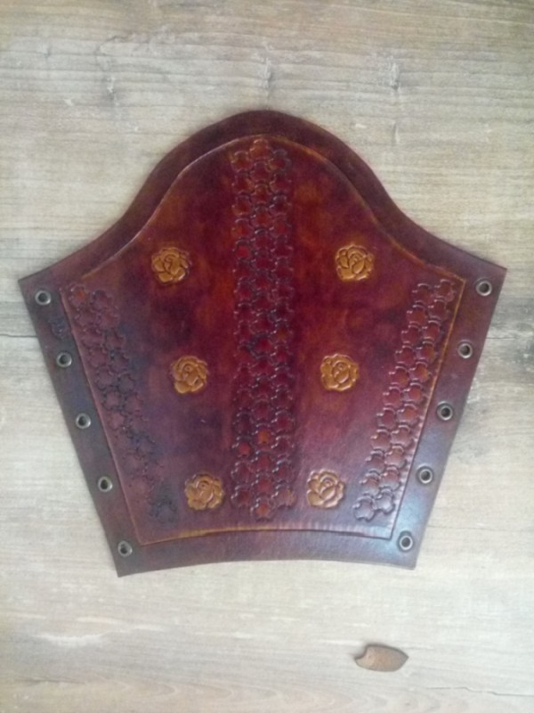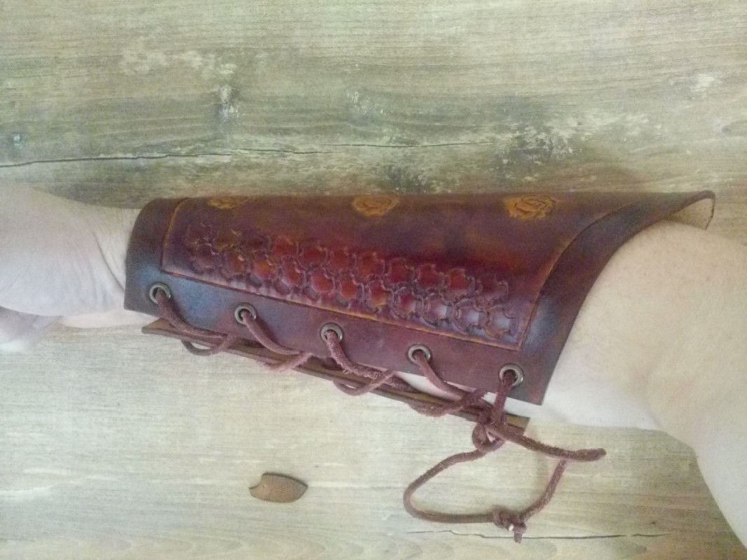 Ręcznie robione skórzane karwasze z grubej skóry bydlęcej garbowanej roślinnie. Bordowe karwasze z motywem sześciu róż w odcieniach brązowego. Ręcznie wycinane, tłoczone i farbowane. Posiada oczka metalowe przez które przewleczony jest rzemień do ich wiązania. Zabezpieczone balsamem do skór, aby dłużej zachowały wygląd.