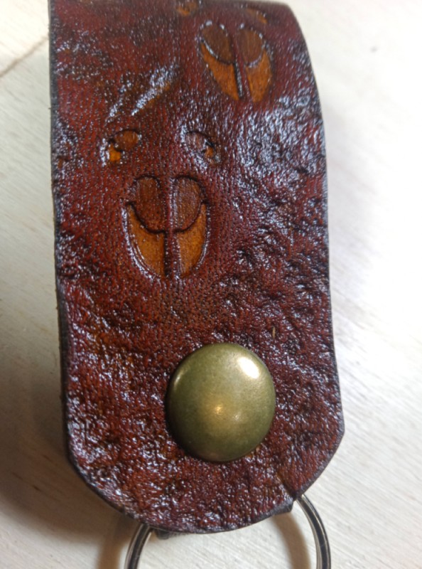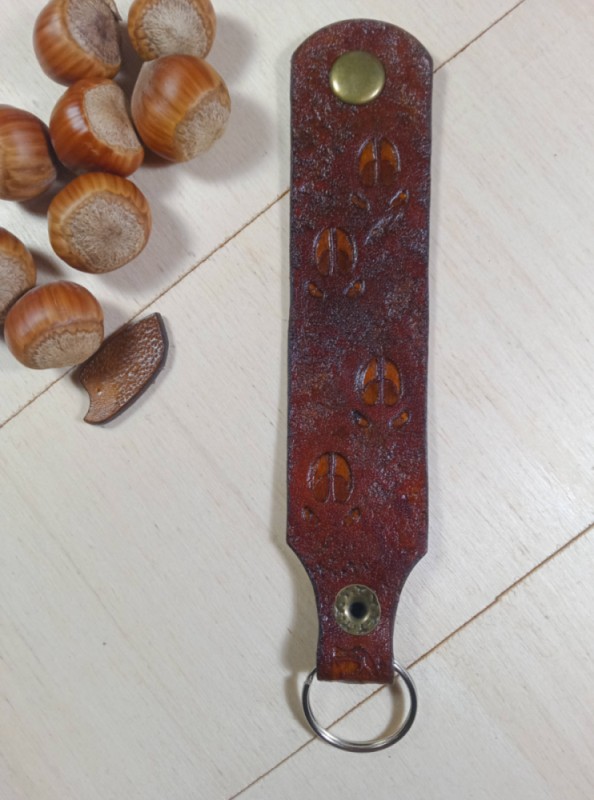 Ręcznie zdobiony skórzany brelok do kluczy – Trop dzika. Zapinany na zatrzask. Krawędzie polerowane ręcznie. Zabezpieczono balsamem do skór.