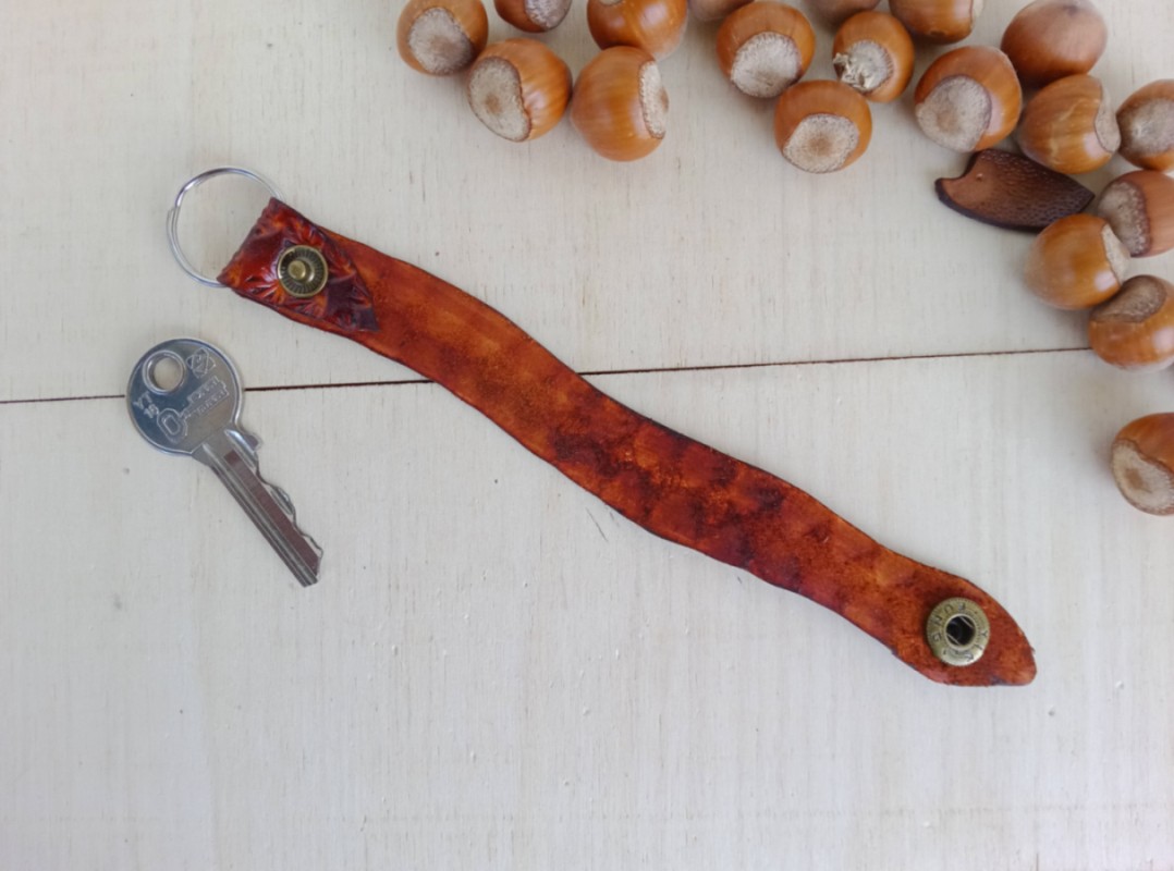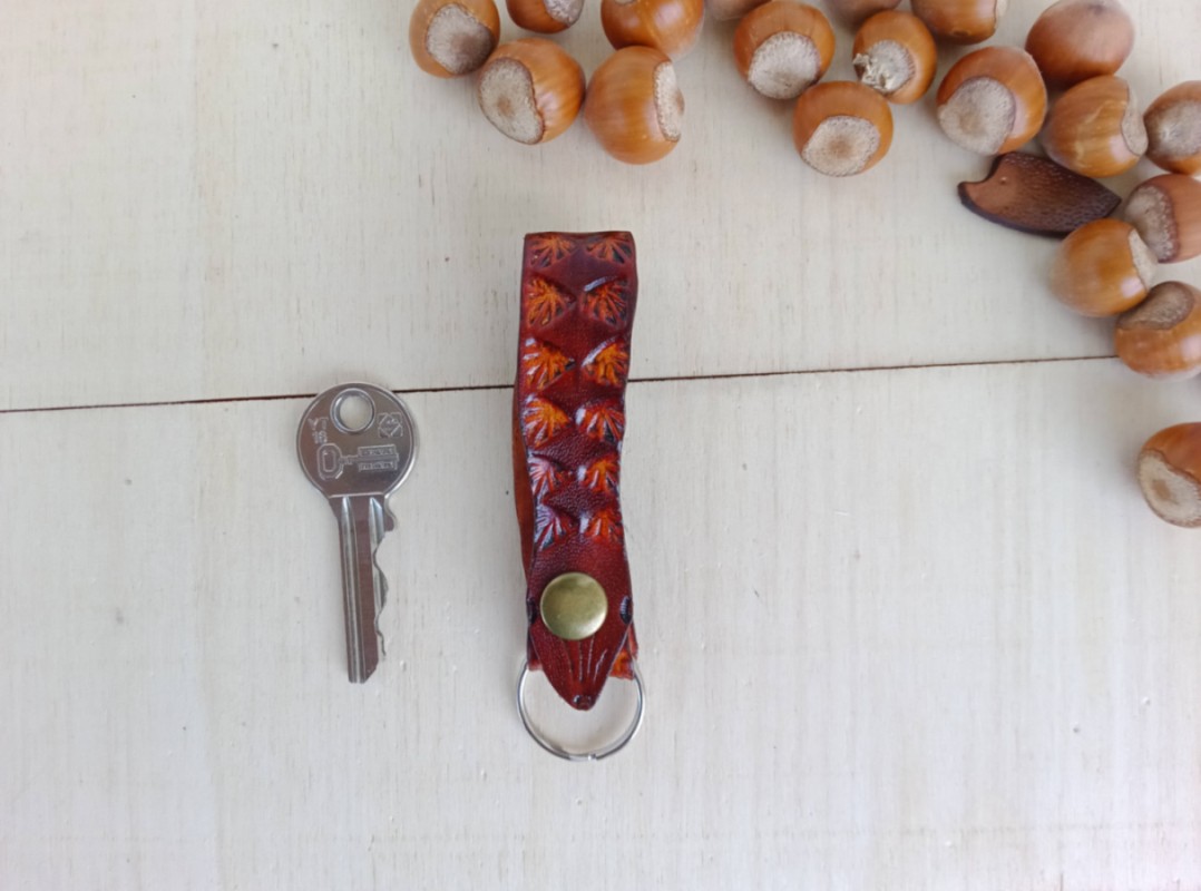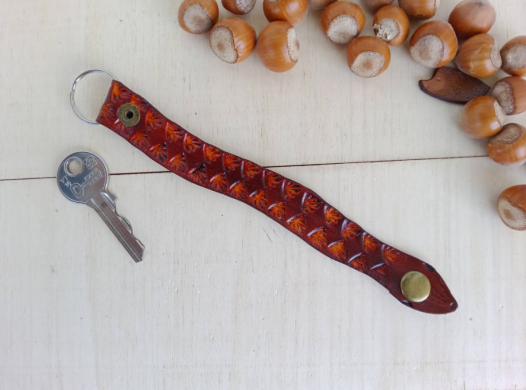 Ręcznie zdobiony skórzany brelok do kluczy – Wąż. Zapinany na zatrzask. Krawędzie polerowane ręcznie. Zabezpieczono balsamem do skór.