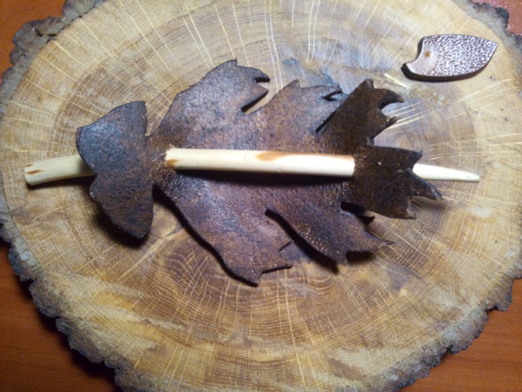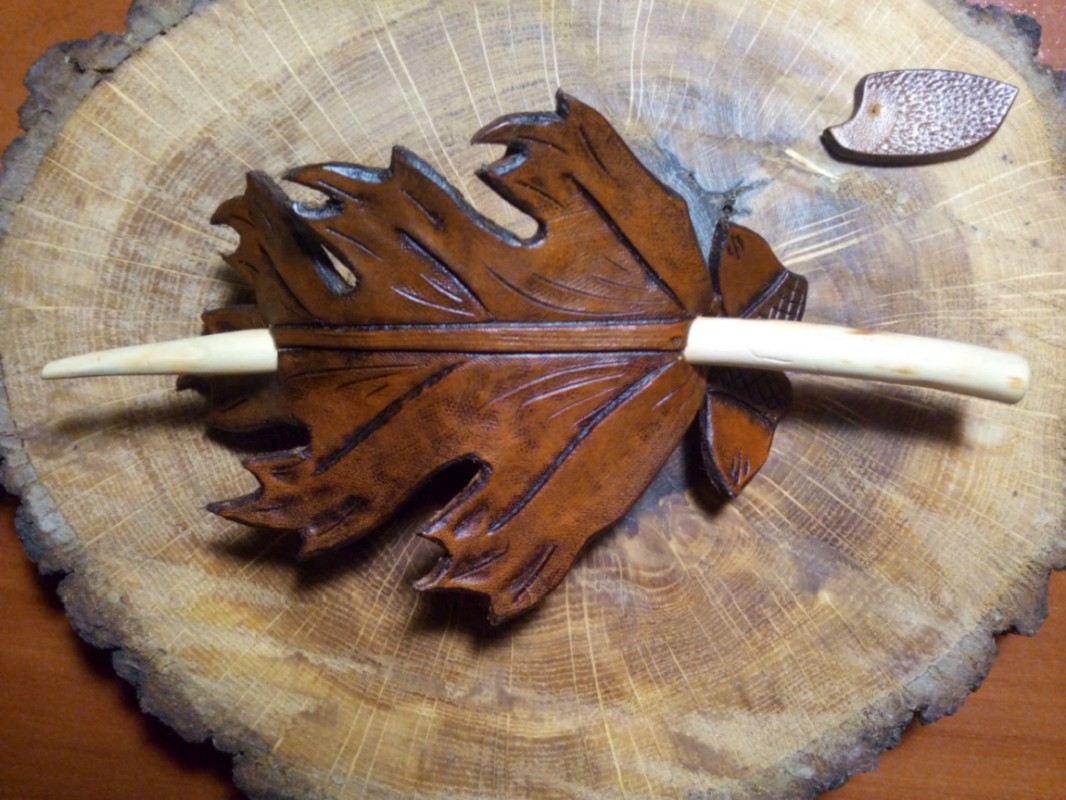 Ręcznie tłoczona skórzana spinka do włosów w kształcie liścia dębu. Krawędzie polerowane ręcznie. Zabezpieczono balsamem do skór. Patyk impregnowany olejem lnianym, dzięki czemu jest idealnie gładki i nie czuć “sztuczności” jak to jest czasami, gdy zabezpiecza się drewno lakierem.