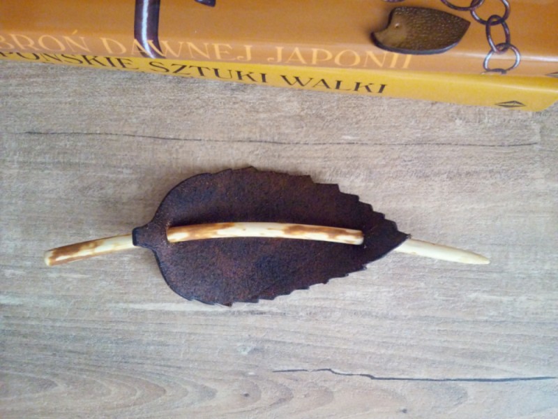 Ręcznie tłoczona spinka do włosów w kształcie liścia. Krawędzie polerowane ręcznie. Zabezpieczono balsamem do skór. Patyk impregnowany olejem lnianym, dzięki czemu jest idealnie gładki i nie czuć „sztuczności” jak to jest czasami, gdy zabezpiecza się drewno lakierem.